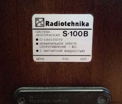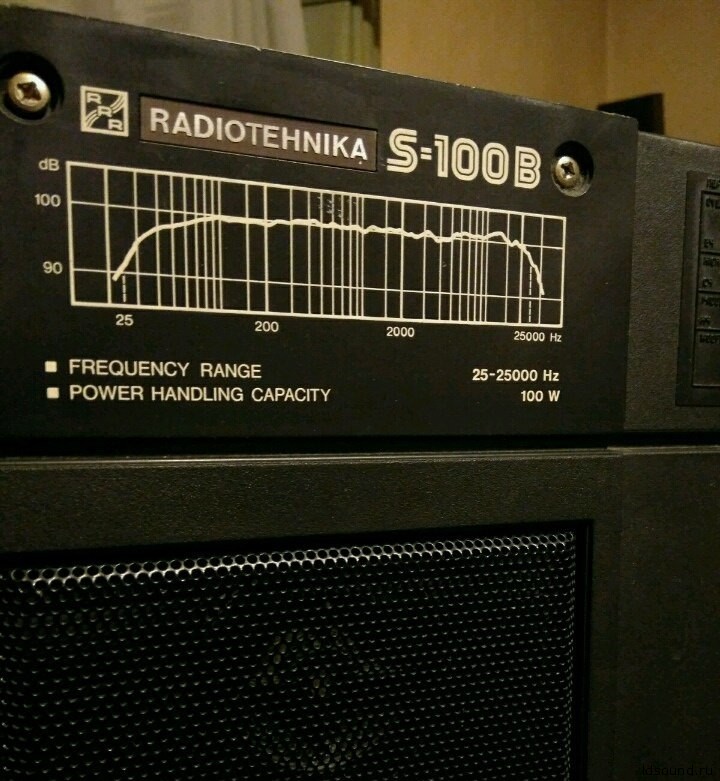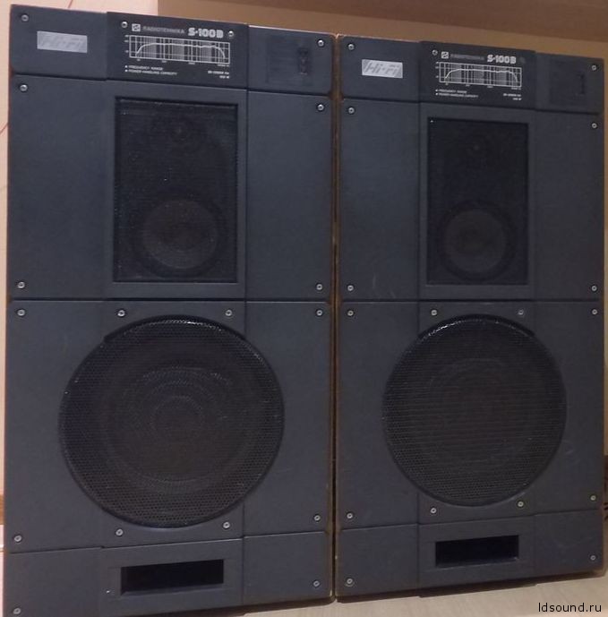 Изготовитель: ПО «Радиотехника», г. Рига. Назначение и область применения: для высококачественного воспроизведения музыкальных и речевых программ в стационарных бытовых условиях. S-100B более мощная модель «S-90B», отличается более мощной СЧ головкой 30 ГДС-3-16, в остальном те же АС. Рекомендуемая мощность высококачественного бытового усилителя 20 – 90 Вт.Корпус выполнен в виде прямоугольного не разборного ящика из древесно-стружечной плиты, фанерованого шпоном ценных пород дерева. Толщина стенок 16 мм, лицевая панель – фанера толщиной 22 мм. На стыках стенок корпуса с внутренней стороны установлены элементы, увеличивающие прочность и жесткость корпуса.Головки обрамлены двумя декоративными накладками, из пластмассы, окрашенными «под металл» или черного цвета. Одна накладка обрамляет СЧ и ВЧ, а также верхнюю половину лицевой панели, другая – головку НЧ и нижнюю половину лицевой панели АС. Головки защищены металлическими сетками. Каждая из накладок закреплена с помощью шести декоративных шурупов. Головка СЧ с внутренней стороны изолирована от общего объема корпуса специальным пластмассовым кожухом в форме усеченного конуса.Головки НЧ, СЧ и ВЧ расположены на лицевой панели по вертикальной оси. На шильдике в верхней части АС изображена кривая АЧХ и дано название АС. В правом углу лицевой панели находятся индикаторы перегрузки АС по каналам, а в нижней части – прямоугольной отверстие фазоинвертора, размером 108х35 мм и частотой настройки 25 Гц. На задней стенке АС укреплен шильдик с основными характеристиками и колодка с зажимами для подключения соединительного шнура, а также регуляторы уровня звукового давления на средних и высоких частотах.Внутренний объем АС – 45 литров. Для уменьшения влияний на АЧХ звукового давления и качество звучания АС резонансов внутреннего объема корпуса, он заполнен звукопоглотителем, представляющим собой маты из технической ваты, обтянутые марлей.Внутри корпуса на одной плате расположены электрические фильтры, обеспечивающие разделение полос АС. Частоты раздела между НЧ/СЧ — 750 Гц (±50 Гц), между СЧ/ВЧ — 5000 Гц (±500 Гц). В конструкции фильтров и блока индикации перегрузки применены резисторы типа ВС, МЛТ, СП3-38Б, С5-35И, ППБ, конденсаторы типа МБГО-2, К50-12, К75-11 и катушки индуктивности на пластмассовых литых каркасах. Технические характеристики: 3-х полосная напольная АС с фазоинвертором. Диапазон воспроизводимых частот: 25 (-14 дБ) – 25000 Гц. Неравномерность АЧХ в диапазоне 100—8000 Гц: ±4 дБ. Чувствительность: 89 дБ (0,56 Па/√Вт). Направленность под углом 25° в горизонте и 7° по вертикале, измеренной по оси АС: в вертикальной плоскости: ±3°. в горизонтальной плоскости: ±4°. Гармонические искажения АС при уровне звукового давления 90 дБ на частотах: 250 — 1000 Гц: 2 %. 1000 – 2000 Гц: 1,5 %. 2000 – 6300 Гц: 1 %. Сопротивление: 8 Ом. Минимальное значение импеданса: 7,6 Ом. Предельная (паспортная) мощность: 100 Вт. Кратковременная мощность: 600 Вт. Установленные динамики: НЧ: 75 ГДН-1-8. СЧ: 30 ГДС-3-16. ВЧ: 6 ГДВ-6-25. Размеры (ВхШхГ): 710х360х285 мм. Вес: 23 кг | |
