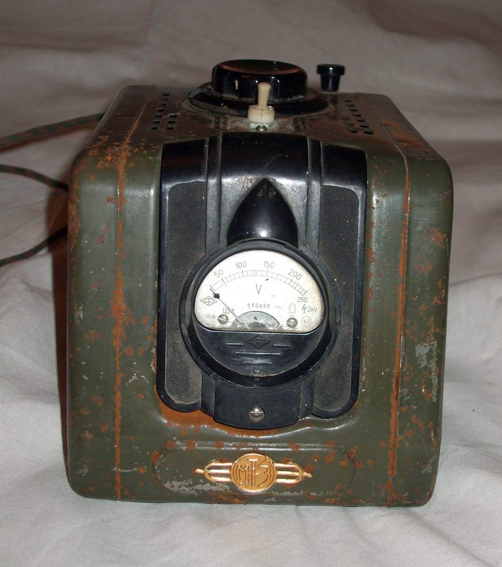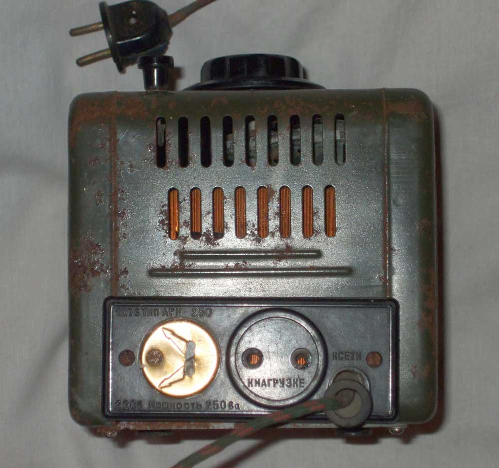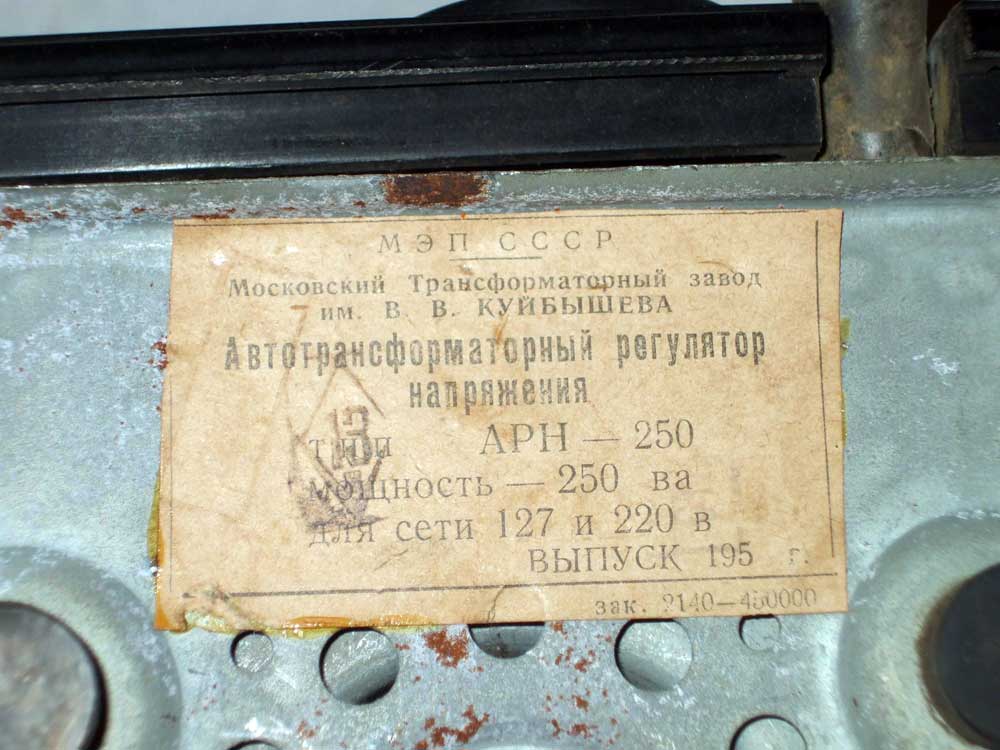 Автотрансформатор "АРН-250" с начала 1957 года выпускал Московский трансформаторный завод имени Куйбышева. Автотрансформаторный Регулятор Напряжения, с мощностью в нагрузке до 250 ватт предназначен для питания телевизоров, приёмников и другой радио или электроаппаратуры при понижении напряжения в электрической сети регулируемым по вольтметру напряжением 220 вольт. | |